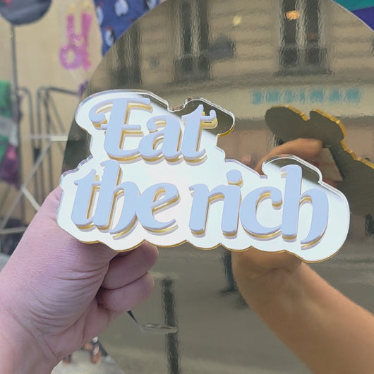 Cette décoration murale “Eat the rich” en acrylique miroir doré ajoute une touche d’humour grinçant et d’attitude à votre intérieur.